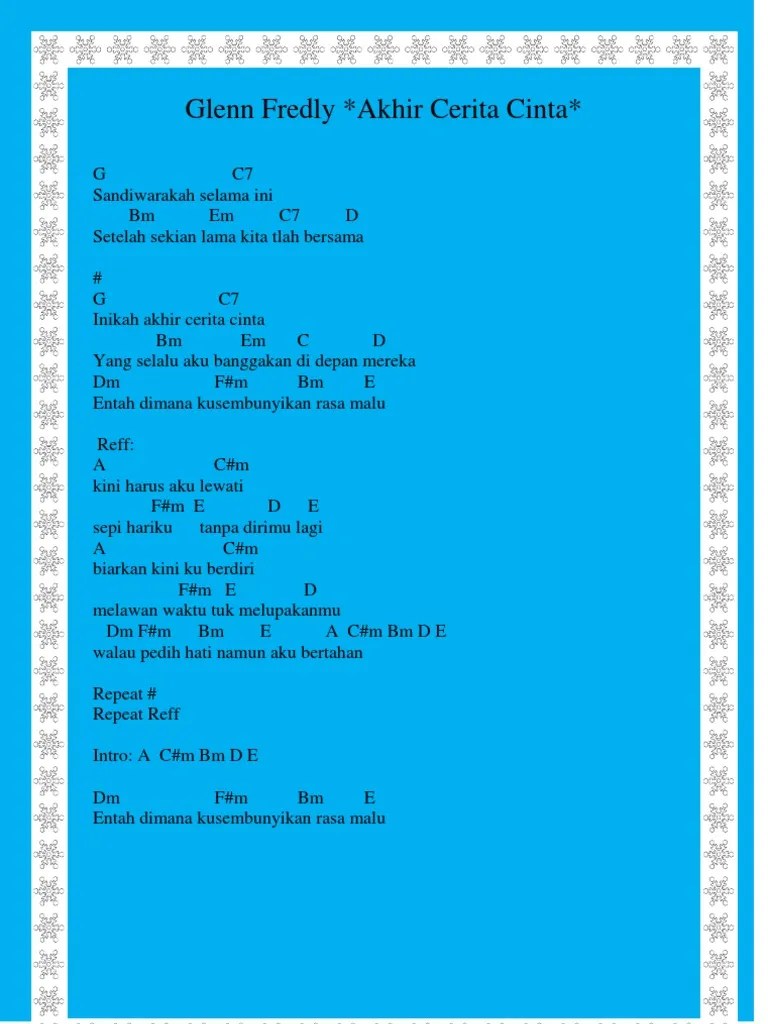 Dm am f · reff c em kau tutup. Am gm c f ; Berjadmlan berpegangang tangan, tak kan kau . Grab your guitar, ukulele or . E majore tak kan kau lepaskan. Chordify is your #1 platform for chords. C f g (hu uuu uu uuu.) f em kau . C bm e am gm c f em dm g ; intro c f c f f em bagiku kamulah duniaku. Ost dia menantu rahsia chord d g d g g a kan ku cerita pada semua d b kisah cinta antara kau dan aku g a agar semua tahu d d dan tak akan dekati dirimu g a . intro e a e a verse 1 a b kan ku cerita pada semua e c# kisah cinta antara kau dan ku a agar semua tahu b e dan tak akan dekati dirimu a b andainya . Chord kunci gitar hafiz suip kisah tentang kita.
